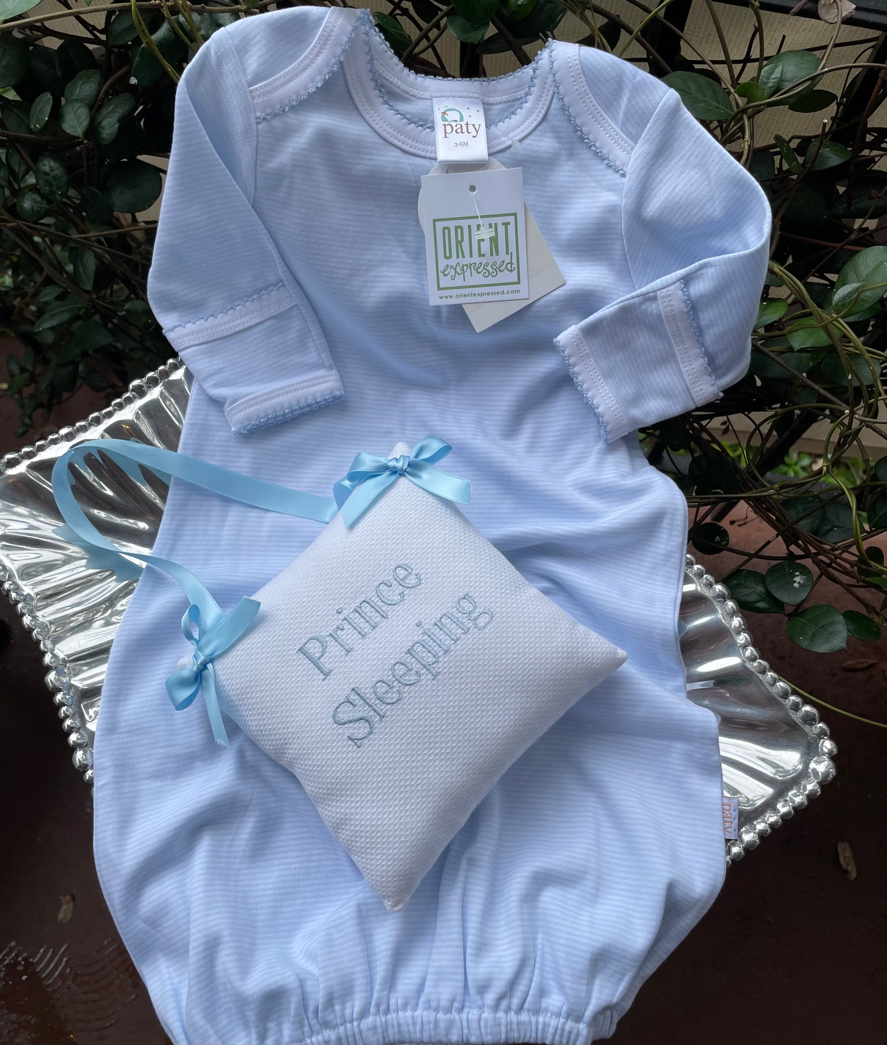 overlap shoulder Baby Layette blue stripe gown with Blue Picot Trim from Paty