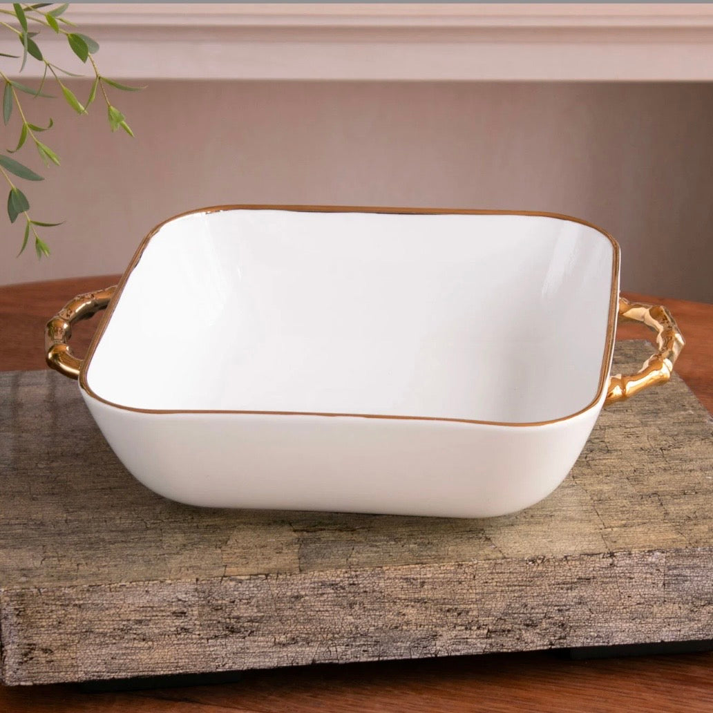 The CERAMIC Bambu Square Casserole in cream & white is crafted in durable porcelain and accented with bamboo-shaped handles in gleaming titanium gold. Perfect for vegetables, side dishes, or desserts, it’s equally at home on weeknight tables and holiday buffets.