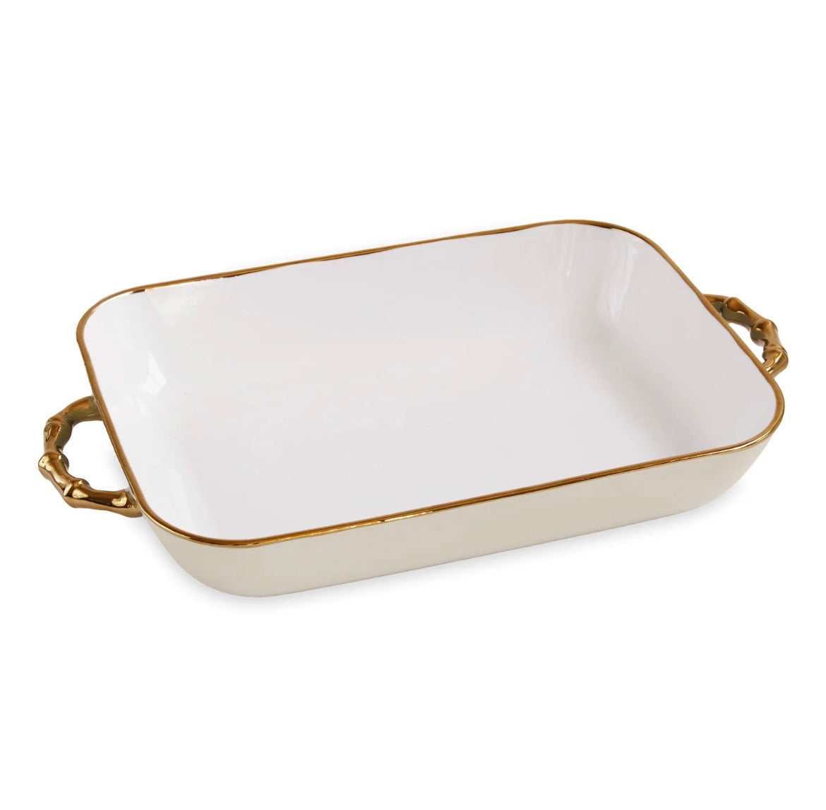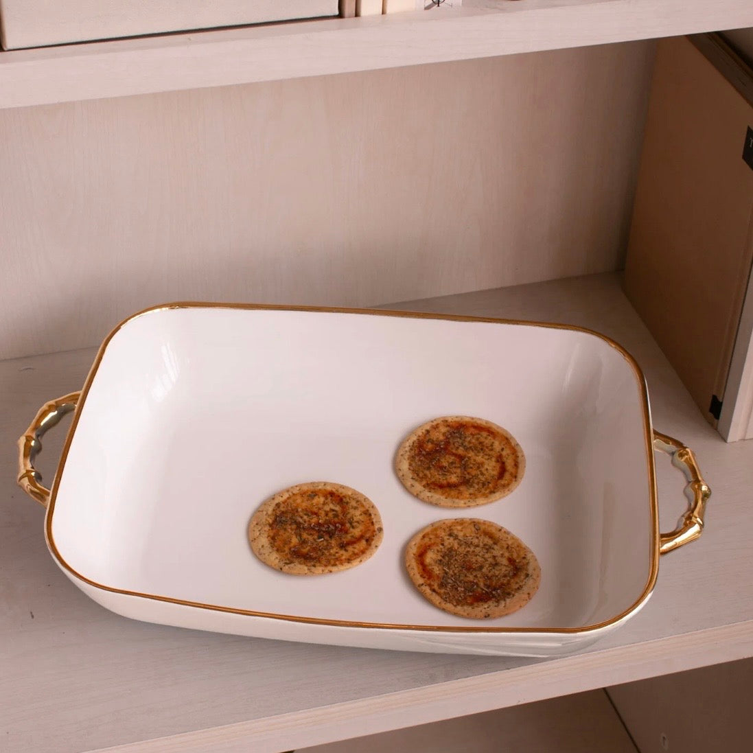 The CERAMIC Bambu Rectangle Casserole in cream & white is crafted in durable porcelain and accented with bamboo-shaped handles in gleaming titanium gold. Perfect for vegetables, side dishes, or desserts, it’s equally at home on weeknight tables and holiday buffets.