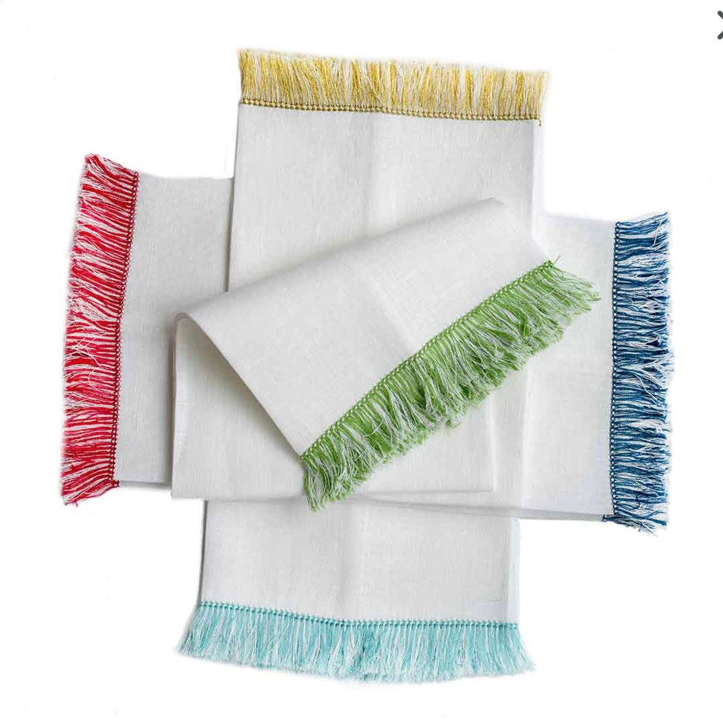 Brighten the guest bathroom or BAR with these fun fringed hand towels! Ready for embroidery or use them as they are, these 100% European linen guest towels measure approximately 14" x 20".